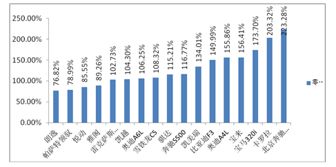 表3-1 国内18种常见车型整车配件零整比数据